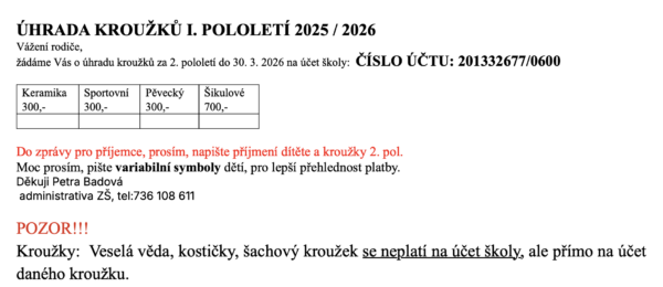 ÚHRADA KROUŽKŮ NA II.POLOLETÍ 2025/2026